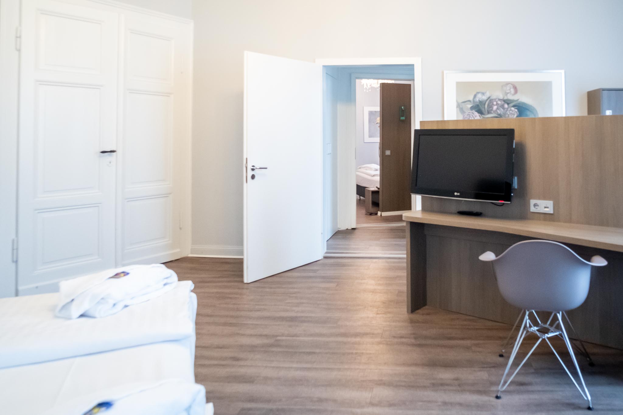 Unsere Doppelzimmer Deluxe sind mit großzügigen Doppelbetten ausgestattet. Ein bequemes Schlafsofa ergänzt die Übernachtungsmöglichkeiten. Bei Bedarf kann für kleine Kinder ein Zustellbett gebucht werden. Im großen Wohn-Schlafbereich eines der beiden Deluxe-Doppelzimmer finden Sie zudem eine kleine Teeküche. Eine Tür verbindet beide Doppelzimmer. So nutzen Sie den kompletten Raum oder schaffen durch das Schließen derselben Rückzugs- und Ruheräume.